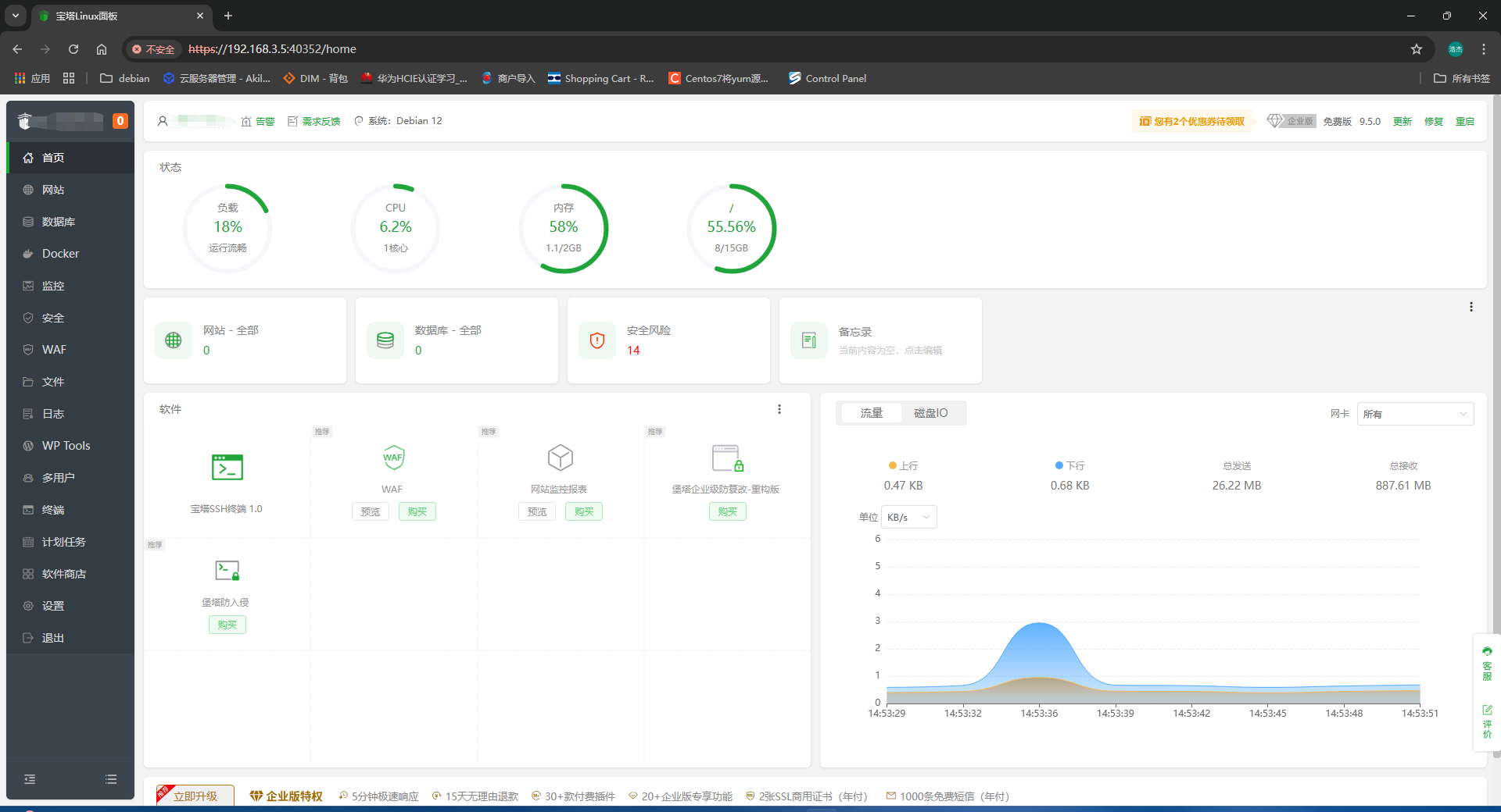 选择好配置后,在首页也能看到当前服务器的负载情况常见的CPU、硬盘、内存、网络等。还有一些常用的软件也可以编辑到首页中来,方便打开使用。