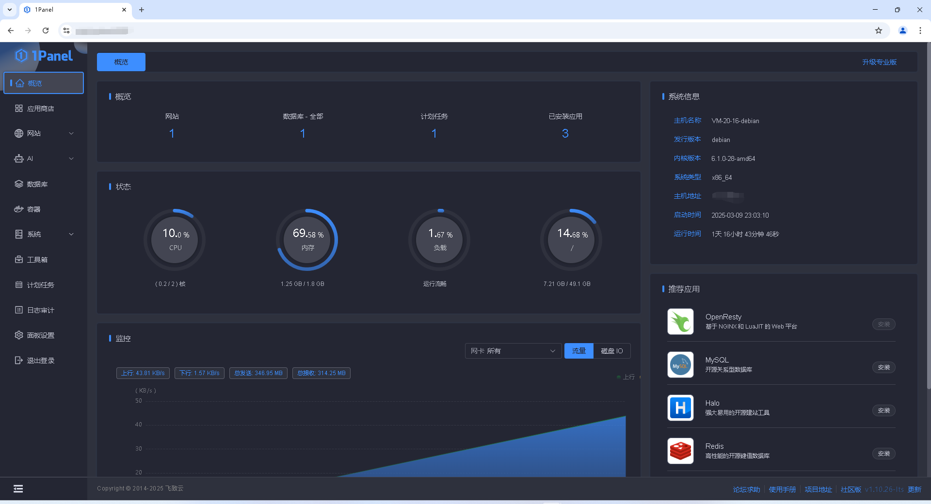 1panel面板(P5、P6、P7),优点:画面简洁,不会有很多的广告(感觉上占用系统资源会少一些)。而且功能大多都免费,只是部分特殊功能,例如手机验证码,但实际上可以邮箱验证替换。同样的进来首页也是展示服务器监控。最主要的,1panel商店里面的应用都会以docker容器的方式给你安装,大幅度减少占用服务器资源(好评!)特别是云服务器本身资源就不多。