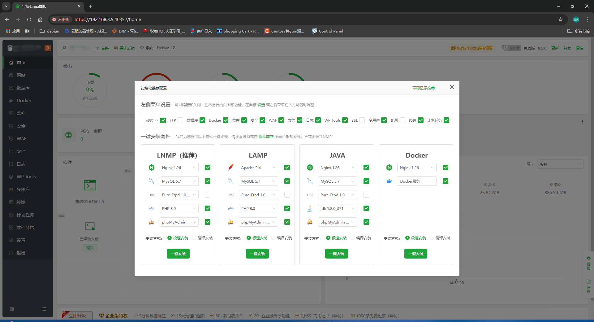宝塔面板(P2、P3、P4),优点:从截屏来看宝塔会显得更专业许多,特别是当你第一次登录后台是,会给你推荐一些常用的初始化环境配置,你只需要点击一键安装即可。