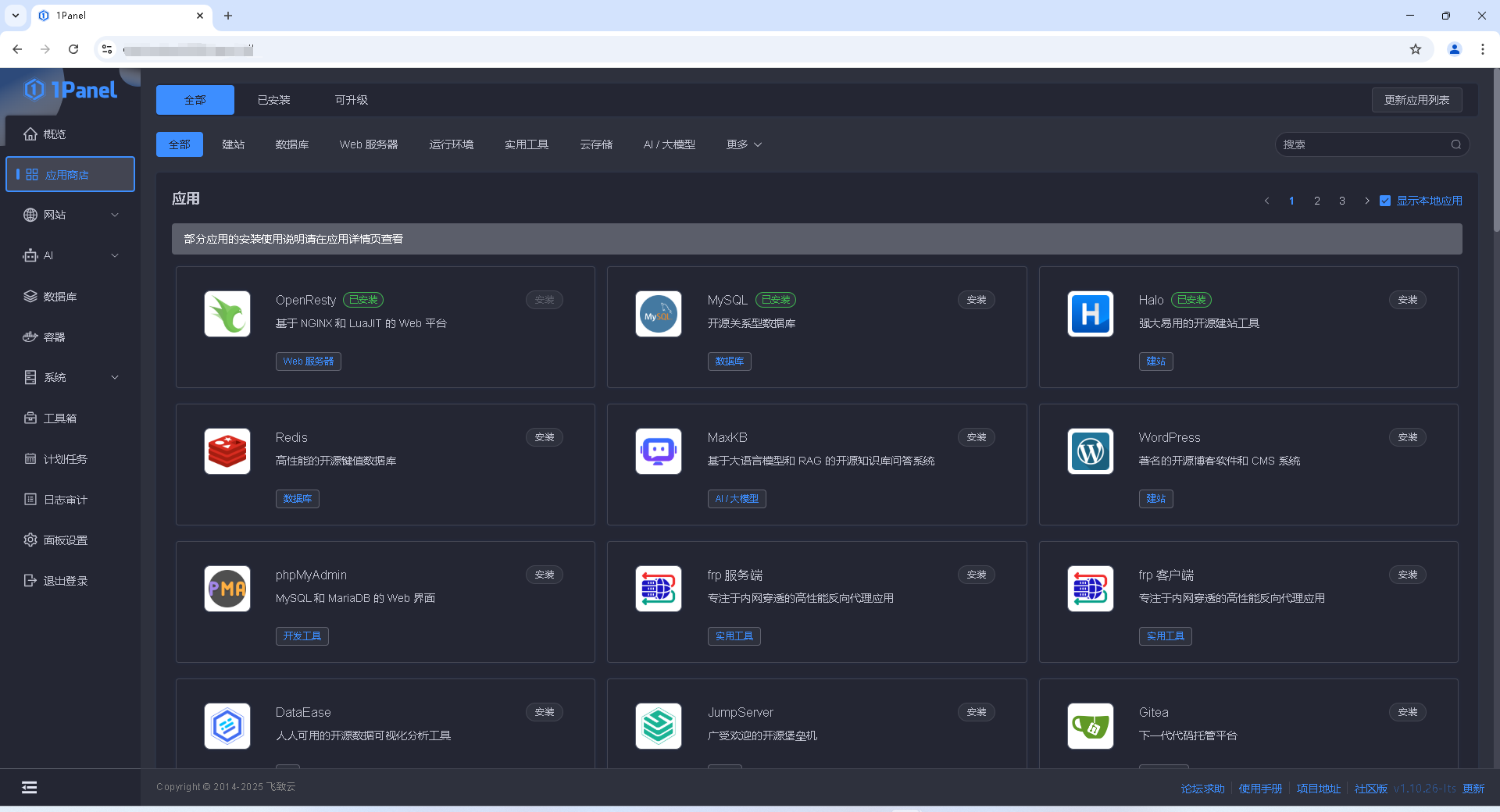 最主要的,1panel商店里面的应用都会以docker容器的方式给你安装,大幅度减少占用服务器资源(好评!)特别是云服务器本身资源就不多。